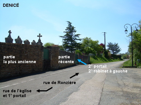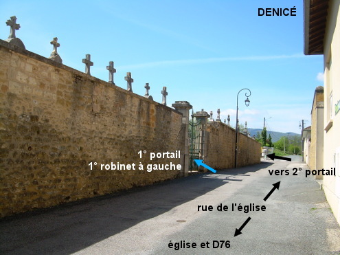 Le cimetière (fléché) est implanté dans l'angle de deux rues secondaires à 125 mètres de la D76 et de l'église. Sur la D76 en provenance de Lacenas, peu après la Mairie sise côté gauche et juste après l'église qui la jouxte et érigée en retrait derrière son parvis, tourner à gauche en direction du cimetière (cf flèche). Peu après, au carrefour en Y prendre la suite de la rue de l'église sur la branche gauche. Le cimetière est implanté côté gauche peu après. En entrant par le premier portail, on trouvera le premier robinet immédiatement à sa gauche. En cas de dysfonctionnement, on peut se rabattre sur le deuxième robinet situé dans la partie plus récente : continuer dans la rue et tourner à gauche au coin du cimetière pour trouver le deuxième portail à 80 mètres du premier. Le deuxième robinet est lui aussi sur la gauche, mais pour y accéder il faudra contourner le muret intérieur (12 mètres à parcourir sur le macadam).