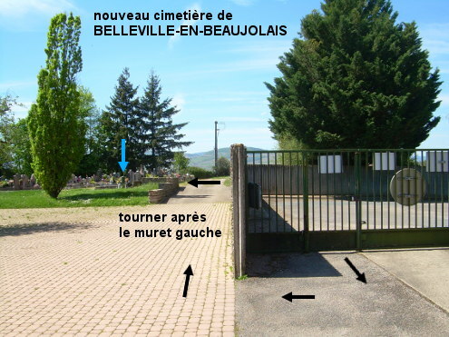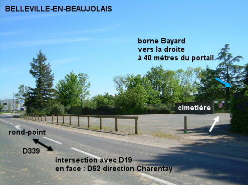Le nouveau cimetière (nommé ''cimetière paysager'' sur les flèches de signalisation) est situé à la périphérie sud-ouest de la ville, à 300 mètres du carrefour D19 / D62. Pour trouver la borne Bayard à l'intérieur du cimetière, entrer par le portail et virer à 180° sur la droite puis prendre l'allée en pavés autobloquants et enfin tourner à gauche derrière l'angle du muret, la borne est alors côté gauche à deux pas (à 40 mètres du portail). N.B. : Il faut actionner la molette droite d'arrière en avant pendant très très longtemps pour faire couler un mince filet d'eau. Sur la D19 en provenance de Saint-Étienne-des-Oullières, au carrefour à gauche avec la D62 venant de Charentay tourner à droite dans la D339 (direction Belleville pour les plus de 7,5 tonnes). Environ 260 mètres après, peu après le panneau annonçant un rond-point, entrer à droite sur le parking du cimetière (emprunter un passage entre les barrières en bois) et parcourir en diagonale les 35 mètres jusqu'au portail. P.S. : À vélo, il vaut mieux retourner au carrefour D19 / D62 pour poursuivre son itinéraire, plutôt que de continuer sur la D339.