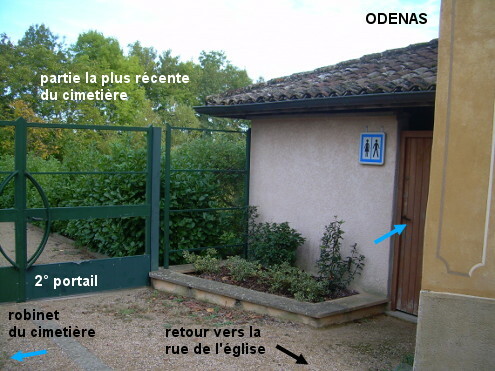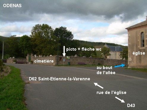 Ces toilettes se trouvent entre le cimetière et l'église situés à la périphérie du village, à proximité de la D62 direction Saint-Etienne-la-Varenne. 1) Sur la D43 en provenance de Saint-Etienne-des-Oullières, 180 mètres après le rond-point avec la D62 direction Saint-Etienne-la-Varenne, tourner dans la première à gauche (rue de l'église, dont le début est en sens unique). Monter jusqu'à l'église érigée côté droit. Sur le mur latéral du cimetière implanté juste après, un panneau fléché avec le pictogramme ad-hoc indique la direction des toilettes à droite au bout de l'allée qui est entre l'église et le cimetière. Les toilettes sont situées sur la droite au bout de ladite allée à 50 mètres de la route (seule la toute fin est en gravillons). N.B. : En plus du lavabo dans les toilettes, on peut utiliser le robinet de la partie la plus récente du cimetière, qui est à gauche en face des toilettes et qui est accessible sans même entrer dans le cimetière : la clôture est en effet constituée de quatre barres métalliques horizontales très très espacées supportées par des poteaux. P.S.: Le premier portail du cimetière au bord de la route est cadenassé. 2) En provenance de Saint-Etienne-la-Varenne sur la D62, à l'entrée d'une courbe à droite on apercevra l'église au loin sur la gauche. Quitter la D62 pour prendre à gauche la direction du vieux bourg, et juste après le panneau de début de village que l'on voyait déjà de loin, on sera à hauteur du cimetière. Prendre à gauche l'allée juste après le cimetière et avant l'église, pour trouver les toilettes au bout de celle-ci. 3) A partir du rond-point entre la D43 venant du Mont Brouilly et la D62 venant de Charentay, prendre la D43 (en direction du centre du village) puis tourner dans la deuxième à droite (rue de l'église) puis idem fin d'itinéraire du point 1.