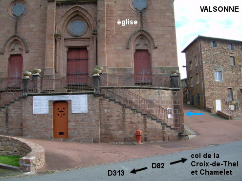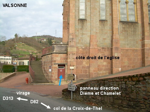 Ces toilettes se trouvent contre la partie droite de l'église érigée au bord de la D82 direction Chamelet. N.B. : Le lavabo est relativement petit. 1) Sur la D82 en provenance du col des Cassettes (et de Tarare via la D56), au carrefour avec la D313, continuer sur la droite puis tourner à gauche dans la suite de la D82 en direction Chamelet. Monter jusqu'à l'église érigée côté gauche. Au début de son côté droit on trouvera la porte des toilettes identifiée par un petit écriteau WC. 2) En provenance de Saint-Clément-sur-Valsonne sur la D313 (route à grande circulation, mais avec des bandes cyclables de chaque côté), on peut prendre un raccourci en repérant au loin le clocher de l'église au sommet d'une rue oblique à droite (il y a une croix à son début). Cette rue débouche en face du coin avant droit de l'église et l'on voit la porte des toilettes.