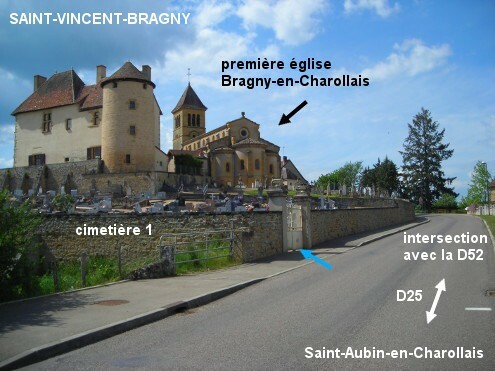 Ce cimetière est situé à l'arrière de la première église (celle de l'ancien village de Bragny-en-Charollais). Il est implanté côté droit sur la D25 en direction de Saint-Aubin-en-Charollais, 130 mètres après l'intersection avec la D52, et 50 mètres avant le panneau de fin de village. Le robinet est à l'intérieur du cimetière, à gauche du portail. N.B. : La commune est issue de la fusion de deux villages, d'où la présence de deux églises et de deux cimetières. Ce cimetière-ci étant celui de l'ancien village de Bragny-en-Charollais.