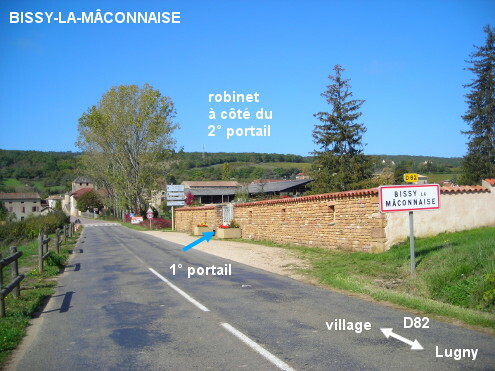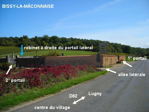 Le cimetière est implanté côté droit à l'entrée du village sur la D82 en provenance de Lugny, au niveau du panneau de début de village. Le robinet est à l'intérieur du cimetière, à côté du portail latéral. 1) Si l'on entre par le portail côté route, parcourir environ 15 mètres sur l'allée gravillonnée puis 12 mètres sur l'allée transverse à gauche jusqu'au portail latéral pour trouver le robinet à sa gauche. 2) Si l'on entre par le portail latéral côté village, desservi par un chemin en terre battue perpendiculaire à la route, on trouvera le robinet à l'intérieur sur la droite.