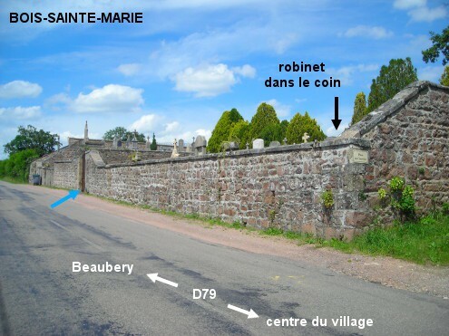 Le cimetière est situé à la sortie du village, côté droit sur la D79 en direction de Beaubery. Le robinet est à l'intérieur du cimetière, à droite plus loin dans le coin.