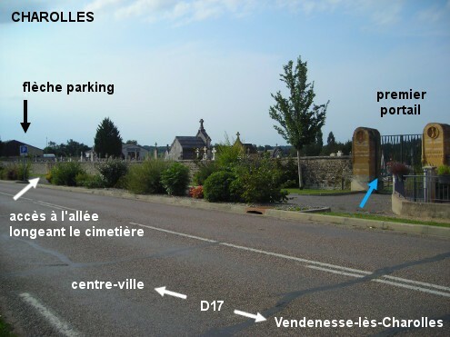 Le cimetière est implanté côté droit à l'entrée de la commune sur la D17 en provenance de Vendenesse-lès-Charolles, assez loin après le panneau indiquant le début de la ville, à l'angle avec l'impasse du Champ de Pierre. Entrer par le premier portail (celui à l'extrémité droite, à côté d'une maison sise au n° 1), le robinet est à l'intérieur du cimetière à droite de ce portail.