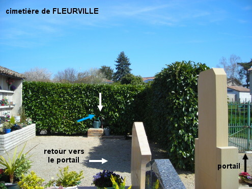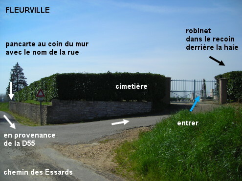 Le cimetière (fléché) est implanté dans une rue secondaire à 210 mètres de la D55. 1) A partir du carrefour D55 / D15, sur la D55 tourner dans la deuxième à gauche 230 mètres plus loin (rue des 4 Vents) puis 100 mètres après prendre la branche gauche d'un carrefour en Y. Le cimetière entouré de haies arbustives est implanté un peu plus loin côté gauche. On verra au début du muret de soutènement la plaque avec le nom ''chemin des Essards'', mais par contre le portail donne dans la voie située juste après et ne se voit pas. Entrer dans le cimetière et contourner la haie plantée à droite du portail pour trouver le robinet au fond d'un grand carré entouré de haies. 2) Sur la D55 en provenance de Lugny, environ 1 km après le panneau marquant le début du village et 110 mètres après un panneau vitesse limitée à 50, tourner à droite en épingle (rue des 4 Vents) pour prendre la direction du cimetière.