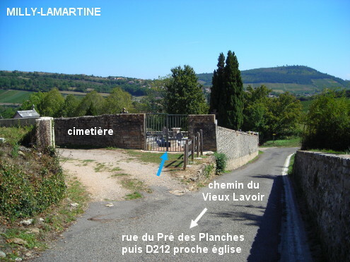 Le cimetière est situé à 280 mètres de la D212 dans une rue secondaire débutant non loin de l'église. 1) Sur la D212 en provenance de Pierreclos, regarder côté droit. Lorsque, après un petit parking on aura aperçu l'église desservie par une rue adjacente, tourner à droite dans la suivante (rue du Pré des Planches) puis dans la troisième à droite en suivant la flèche ''cimetière'' (chemin du Vieux Lavoir). Le cimetière est implanté côté gauche un peu plus loin. Entrer par le portail qui nous fait face et qui est desservi par une très courte allée. Le robinet est à l'intérieur du cimetière, à gauche du portail. 2) Dans l'autre sens de circulation sur la D212, on voit la flèche ''cimetière'' au début de la rue du Pré des Planches.