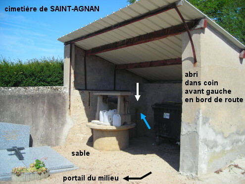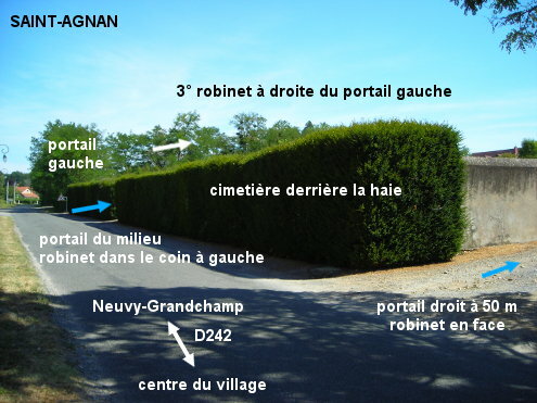 Le cimetière est implanté côté droit à la sortie du village sur la D242 en direction de Neuvy-Grandchamp, 100 mètres avant le panneau de fin de village (distance mesurée par rapport au portail situé au bord de la route). Il comporte trois portails (plus ou moins faciles d'accès et plus ou moins faciles à ouvrir) et trois robinets. 1) Le portail du milieu, situé au milieu du mur longeant la route et entre deux immenses haies arbustives cachant la totalité du mur, est très difficile à ouvrir : quand le loquet est tiré (difficile à actionner) il faut pousser fort car les deux battants frottent l'un contre l'autre (il est en outre lourd et grippé). Ensuite il faut parcourir sur la gauche 30 mètres d'allée très sablonneuse jusqu'à un abri dans le coin avant gauche, pour trouver le premier robinet sur le mur derrière le puits. 2) Le portail de droite, desservi par une allée caillouteuse de 50 mètres en pente ascendante qui longe la droite du cimetière, est un peu moins difficile à ouvrir : pour manœuvrer le loquet il faut empoigner les deux tiges de part et d'autre du portail et tirer fort, ensuite le portail s'ouvre facilement. Faire ensuite une douzaine de pas (sol plus ferme) pour trouver le deuxième robinet face au portail, fixé sur le mur de droite. 3) Le portail de gauche, également desservi par une allée caillouteuse de 50 mètres mais davantage carrossable, est quant à lui très facile à ouvrir : une simple poignée et aucun frottement. Le troisième robinet est à l'intérieur, immédiatement à droite.