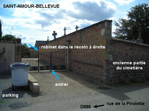 Le cimetière est situé dans une rue secondaire à 240 mètres de la D686, il est fléché depuis le carrefour près de l'église. En provenance du Plâtre-Durand sur la D686, vers l'église érigée côté droit, quitter la D686 qui oblique à droite, pour continuer tout droit dans la rue de la Pirolette en suivant la flèche ''cimetière'' (le sens interdit n'est en vigueur que de 8h45 à 9h15 et de 16h15 à 16h45 du lundi au vendredi et de 11h45 à 12h15 les samedis). Lorsque l'on arrive vers le cimetière implanté côté gauche, on verra d'abord un portail sur le premier mur latéral desservi par une allée, qui donne dans la nouvelle partie du cimetière, puis 50 mètres plus loin au bord de la route un autre portail donnant aussi dans cette partie mais à côté de l'ancienne partie. Si l'on entre par le premier portail cité, il faudra se diriger tout droit sur l'allée dallée en direction du portail intérieur donnant dans l'ancienne partie du cimetière, pour trouver le robinet dans le recoin en arc de cercle à droite avant ce portail intérieur. Si l'on entre par l'autre portail, à côté du mur de séparation des deux parties, on trouvera le robinet sur la droite dans le recoin avant le portail intérieur.