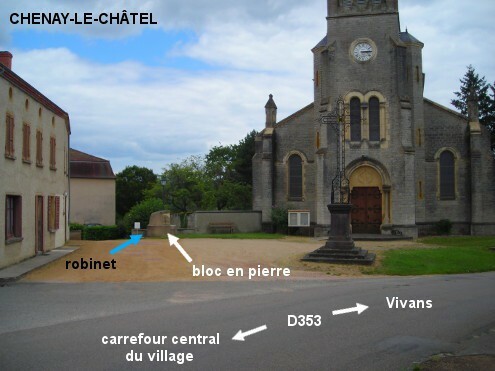 Ce robinet est fixé sur un espèce de gros bloc en pierre ressemblant à un cylindre court, situé à gauche de l'église. A partir du carrefour central du village, prendre la D353 direction Vivans, l'église est implantée côté gauche quelques mètres plus loin.
