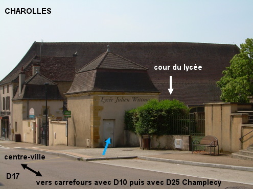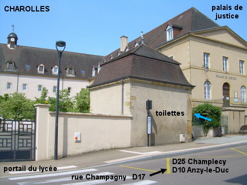 Ces toilettes sont situées devant la cour du lycée et à gauche du palais de justice, au bord de la D17 à proximité des carrefours avec la D10 et avec la D25 direction Champlecy. 1) En provenance de Champlecy, quand la D25 rejoint la D17 continuer sur la gauche en direction du centre-ville, 70 mètres après le carrefour à droite avec la D10 direction Lugny-lès-Charolles on sera devant le bâtiment des toilettes, situé entre le portail du lycée (à sa gauche) et le palais de justice (au n°15 à sa droite et en surplomb). L'entrée des toilettes, qui nous fait face, est surmontée d'une grande inscription ''lycée Julien Wittmer'' car le bâtiment est accolé à la cour du lycée. 2) A partir d'autres provenances, suivre la direction de Paray-le-Monial (via la D17 qui rejoint la N79) puis vers le palais de justice chercher les toilettes côté gauche.