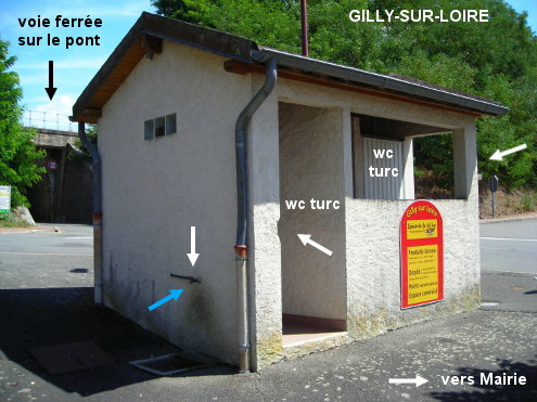 Ces toilettes sont situées à proximité de la Mairie sur la D195, entre le pont sous la voie ferrée et la D979. En provenance de Chalmoux sur la D195, aussitôt après être passé sous le pont, on verra sur la droite derrière l'angle avec la rue adjacente (et avant la Mairie) le petit bâtiment des toilettes. Le robinet (de type vanne, l'eau gicle !) est fixé sur le mur extérieur opposé à la D195. N.B. Si l'on vient de Perrigny-sur-Loire en suivant l'itinéraire vélo fléché en direction de Bourbon-Lancy, quand on arrive au carrefour en T à côté de la voie ferrée, tourner à gauche sous le pont.