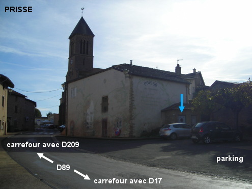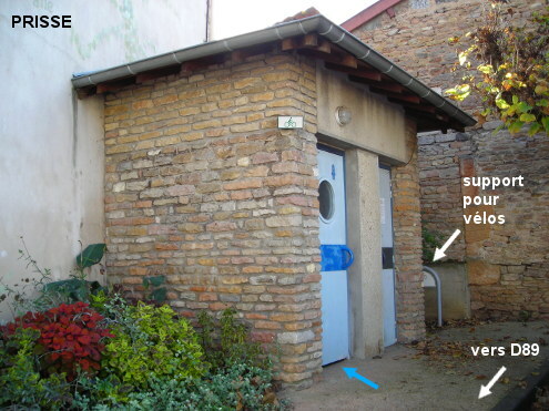 Ces toilettes sont situées au fond d'une place à proximité de l'église. 1) Sur la D89 en provenance de la D17, au sortir d'un tronçon de rue étroit et au carrefour avec deux rues adjacentes, on verra dans l'angle droit derrière la rue conduisant au cimetière, la place avec parking au fond de laquelle il y a les toilettes. Le petit bâtiment est accolé à deux murs dans le coin gauche et la porte des toilettes est celle de gauche. N.B. : Le lavabo est plutôt petit. 2) Sur la D89 en provenance de Crêches-sur-Saône, après le carrefour à gauche avec la D209 direction Davayé, peu après l'église érigée côté gauche et juste derrière un bâtiment avec des dessins peints sur sa façade, entrer à gauche sur le petit parking pour trouver les toilettes dans le coin à gauche.
