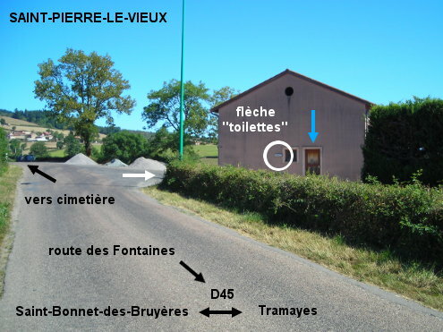 Ces toilettes sont situées à proximité du cimetière, dans une petite partie d'un immense bâtiment, à 300 mètres du carrefour D45 / D211. Sur la D211 en provenance de Saint-Christophe, à l'intersection avec la D45, continuer tout droit dans la route des Fontaines en direction du cimetière. Le très grand bâtiment rectangulaire est construit de manière un peu oblique côté droit, peu avant le cimetière implanté côté gauche. On ne le découvre que tardivement à cause de haies arbustives hautes. Sur son pignon qui nous fait face en biais, il y a une petite flèche indiquant que l'unique porte en bois de ce côté est celle des toilettes.