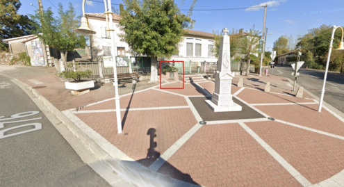 Derrière le monument aux morts, parfois cachée par du feuillage
