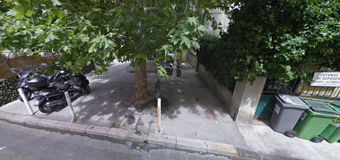 Petite place avec table de restaurant, en haut, sous le platane, juste face à l'entrée du théâtre.