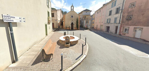 Sur la petite place à l'intersection de la rue des Boyers et de la route de Gonfaron