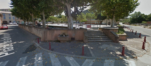 La fontaine se trouve sur la route principale au pied des escaliers du boulodrome