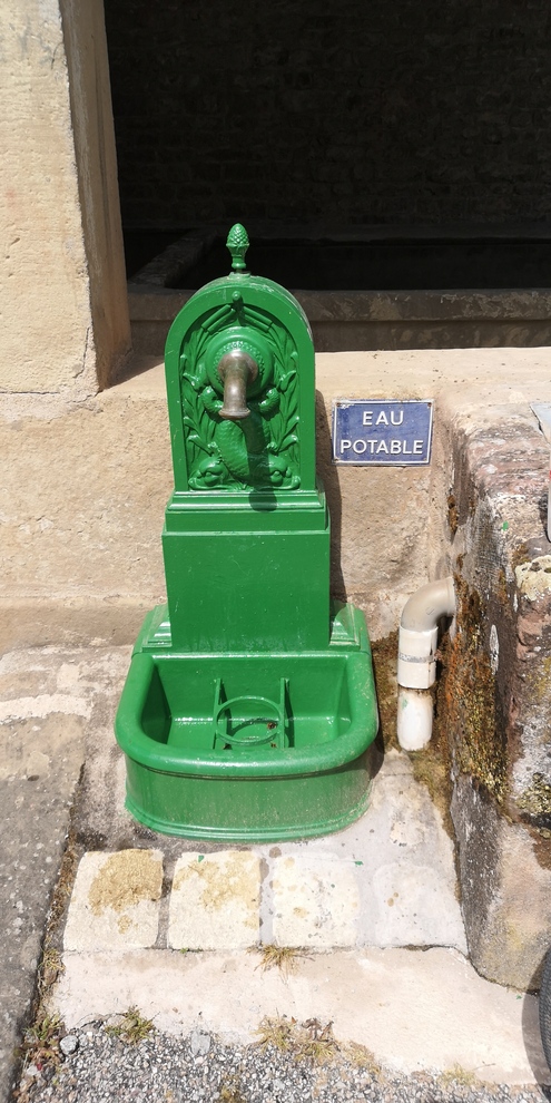 À l'entrée du lavoir d'Attigny, il y a une fontaine à eau de couleur verte. Il est indiqué que l'eau est potable.