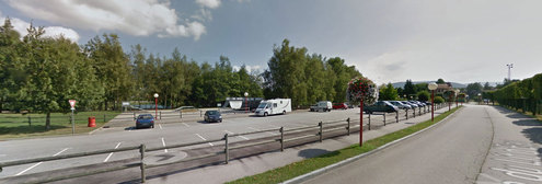 Derrière le skate park, une borne à eau se trouve dans l'herbe.